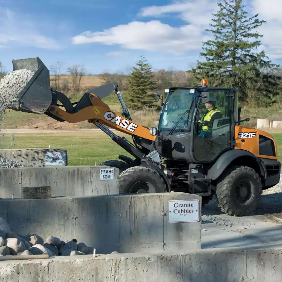 The CASE 321F Compact Wheel Loader, the Tier 4 Final F Series pinnacle, combines formidable power with precision control. Boasting a Z-Bar linkage, it achieves a remarkable full-height lifting capacity exceeding 8,000 lbs. (3,640 kg) and a bucket breakout force of up to 11,000 lbs. Its compact stature, at just 8 ft. 10 in. (2,681 mm) tall, doesn’t compromise its capability. Enhanced with suspension upgrades, a standard skid steer coupler, and superior auxiliary hydraulics, the 321F is designed to handle diverse tasks efficiently.