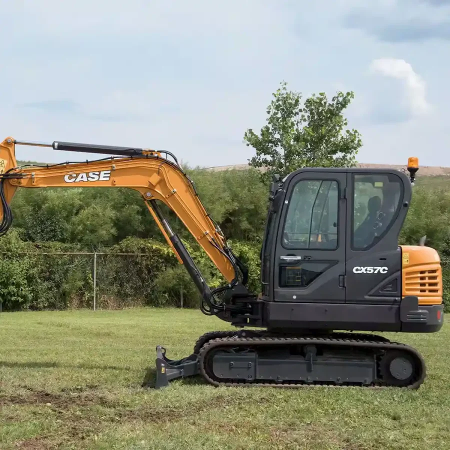 The CASE CX57C Mini Excavator stands out in our diverse construction machinery portfolio. This “large” mini excavator sets the benchmark with its exceptional horsepower, adept at tackling the rigors of substantial excavation tasks. Distinct from its peers in the C Series, the CX57C boasts a traditional tail-swing design complemented by a significant counterweight, ensuring a performance level on par with larger excavators within a compact footprint. It comes with a range of standard performance-enhancing features. These include a deluxe cab equipped with a 7-inch LCD touchscreen monitor, which takes the CX57C to the next level regarding power, versatility, and user-friendly operation.