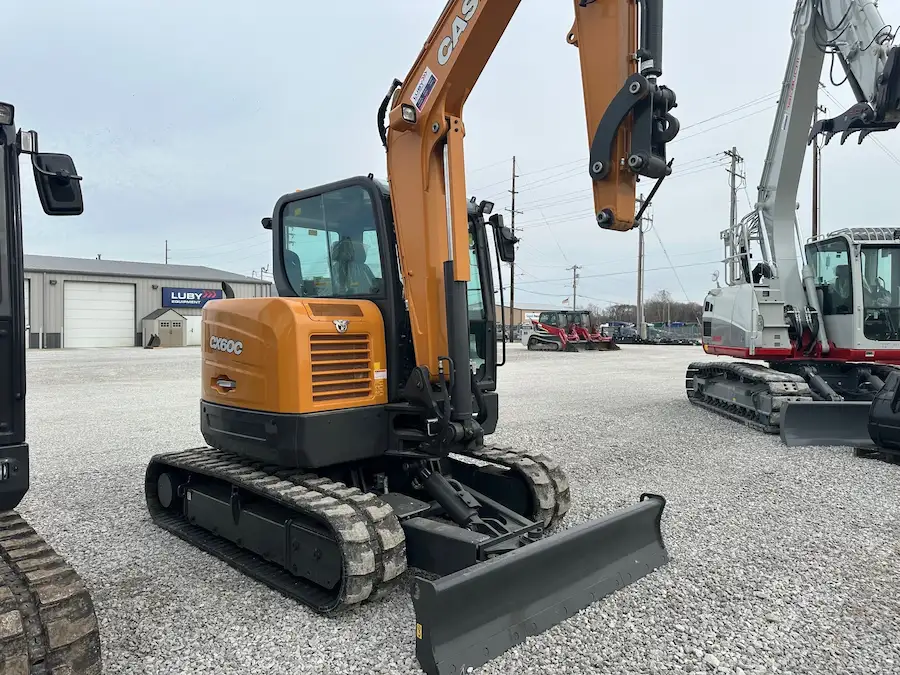 CASE CX60C Mini Excavator for sale at Luby Equipment – Enclosed Cab, Two Speed, Rubber Tracks, 2-Way Aux Joystick, Long Arm w/Thumb, LED Beacon, 4-Way Angle Dozer Blade, 2-Way Hydraulic Quick Coupler, Additional Counterweight