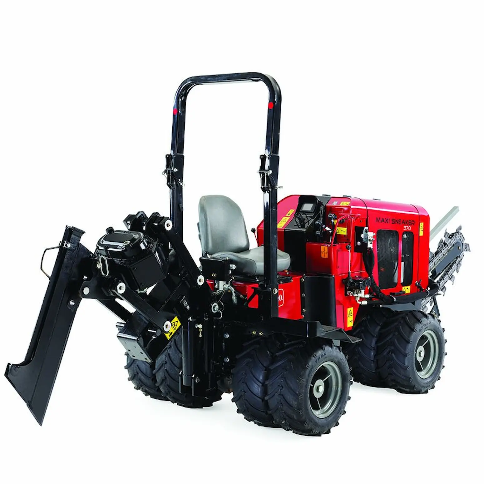 The design of the Maxi Sneaker® 370 prioritizes operator ease and comfort. With an optimized operator’s position, operators have a clear view of all four tires during trenching, plowing, or transporting. The foldable ROPS enhances transportation convenience and accessibility, making the Maxi Sneaker® 370 practical and powerful.